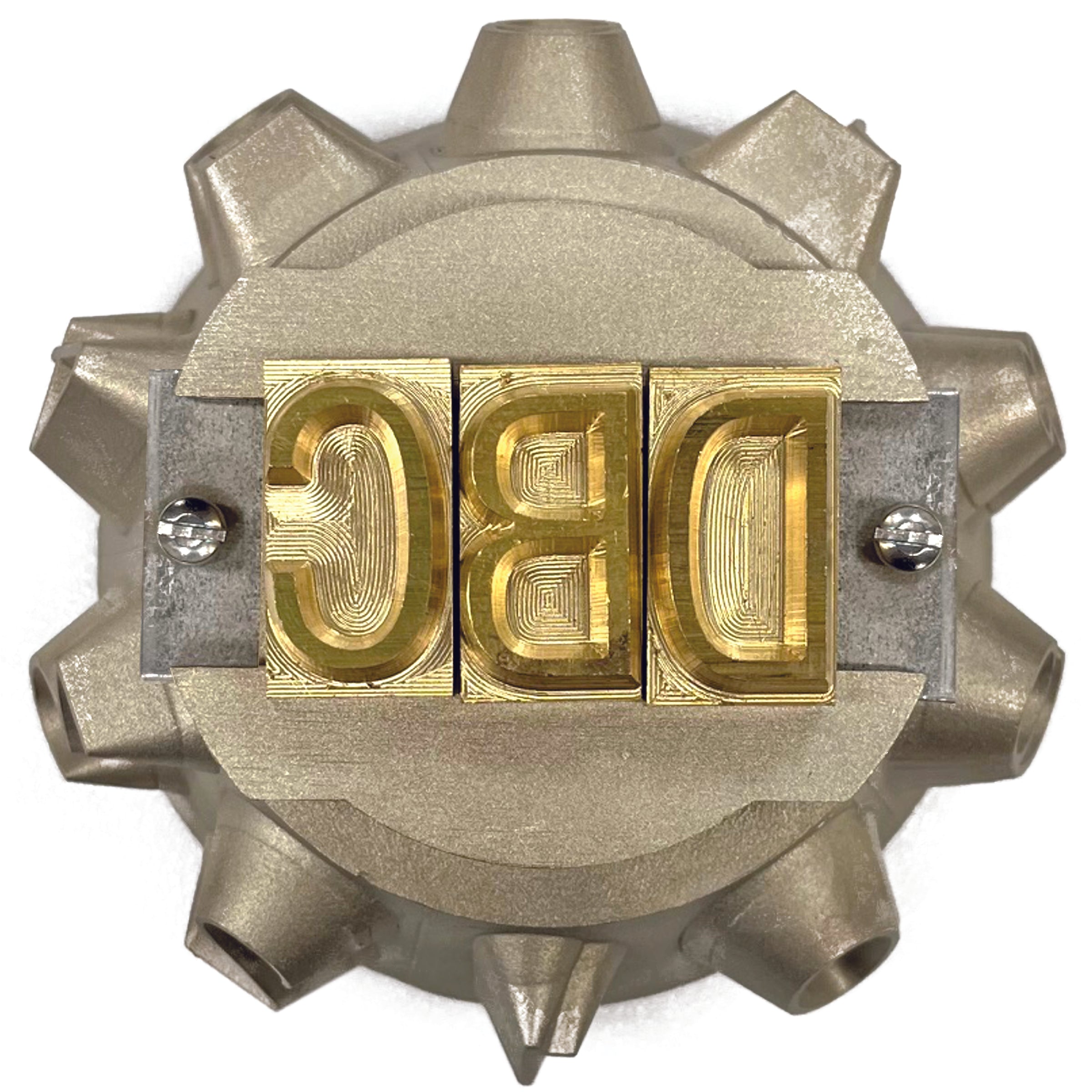 The tire branding iron head has 1 inch tall numbers 0 thru 9 engraved around the circumference of the head. On the face of the brander is a single slot that holds up to three (3) 1 inch character interchangeable stamps. TOOL DOES NOT INCLUDE INTERCHANGEABLE TYPE. See Interchangeable Type for type information and pricing,